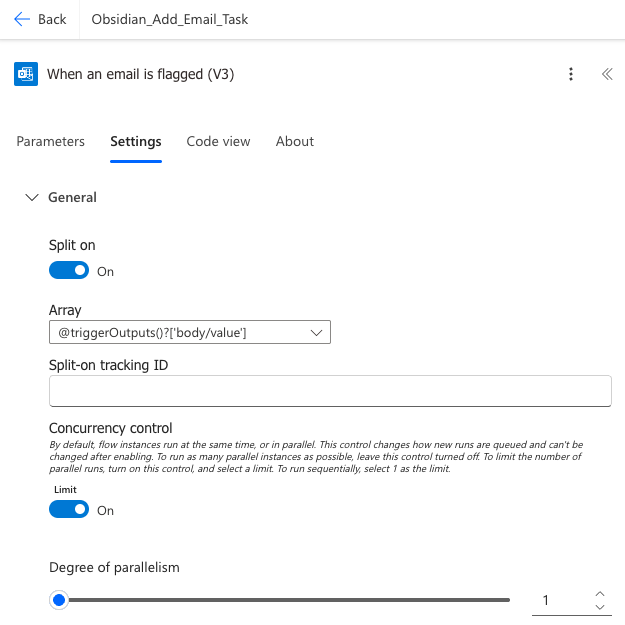 To prevent race conditions while reading and writing files in OneDrive, I recommend setting the parallelism in the Automate Flow trigger to 1. This ensures even during rapid task creation—such as quickly flagging several emails—that Power Automate flows do not attempt to modify the same OneDrive file simultaneously.